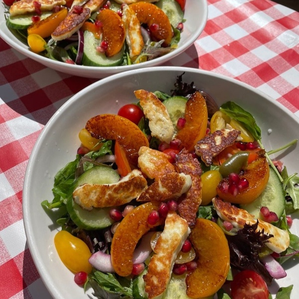 - Honey Roasted Peach, Feta & Pomegranate Salad. A vibrant, summery salad bursting with colour and flavour – sweet roasted peaches, crumbled feta, juicy pomegranate seeds, cherry tomatoes, sweet peppers, cucumber, and red onion atop a bed of fresh baby leaf greens.