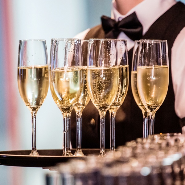 - pizza and glass of Prosecco for four