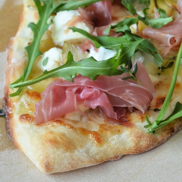 Speck ham, red onions, Parmesan, rocket salad, and balsamic vinegar.