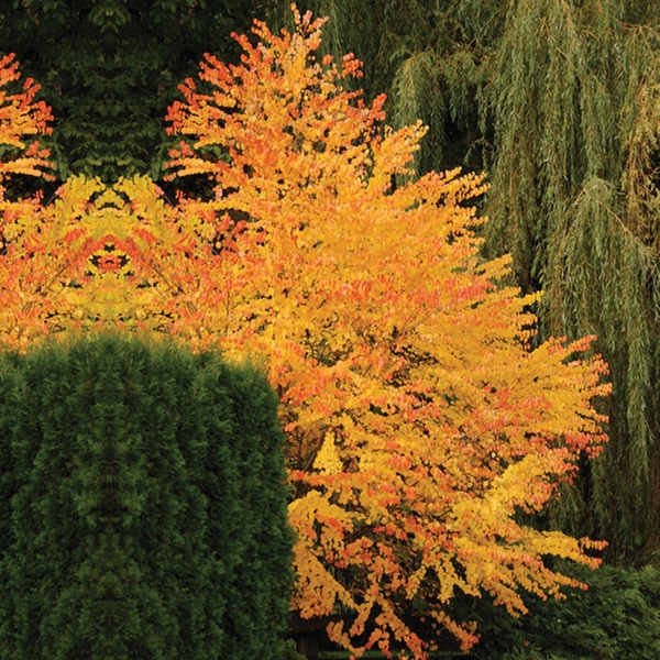 - Foliage transitions from deep red to burnt orange and golden yellow