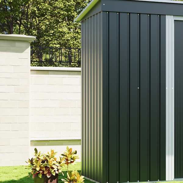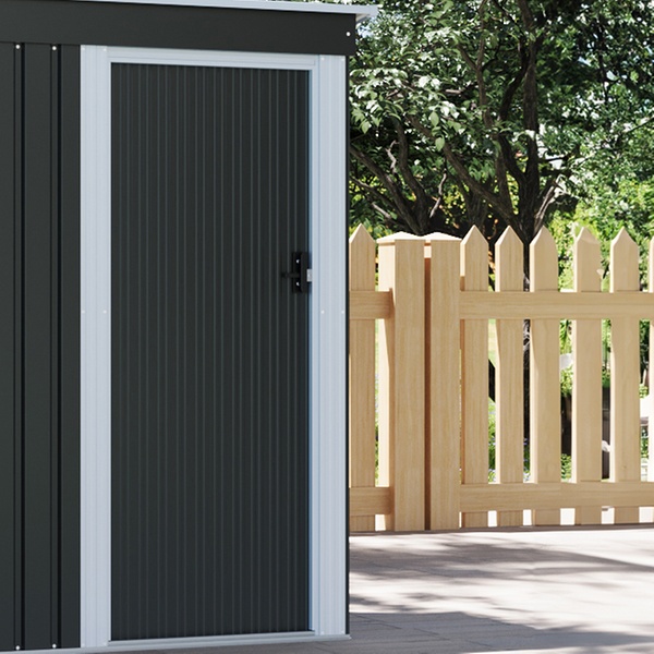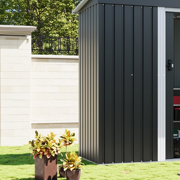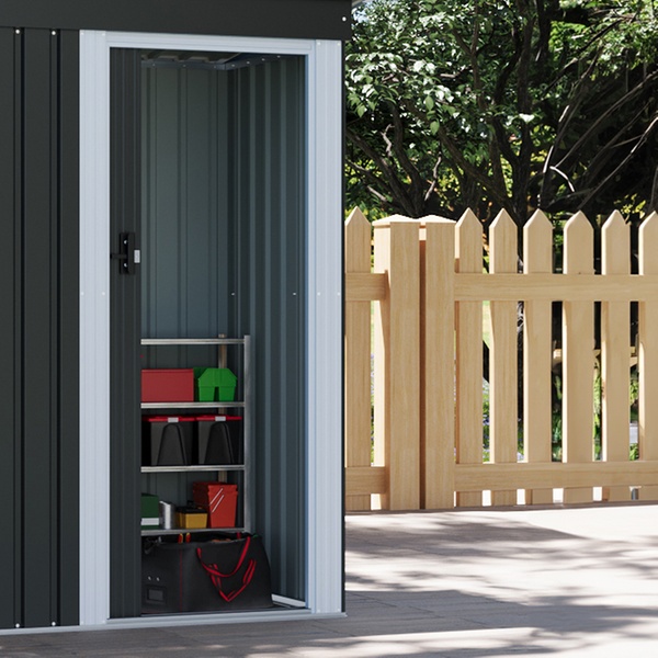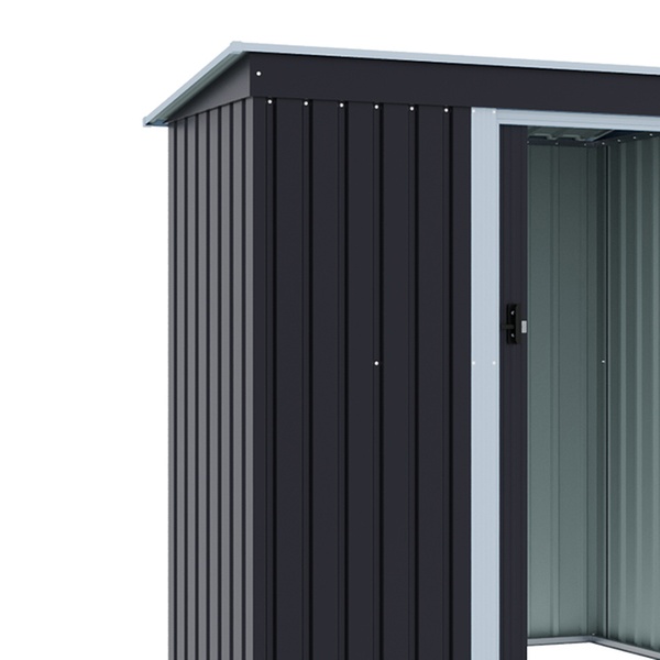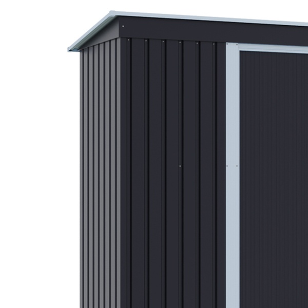 Effortlessly stylish and robust, this sleek charcoal black storage shed maximizes space while keeping belongings secure and organized