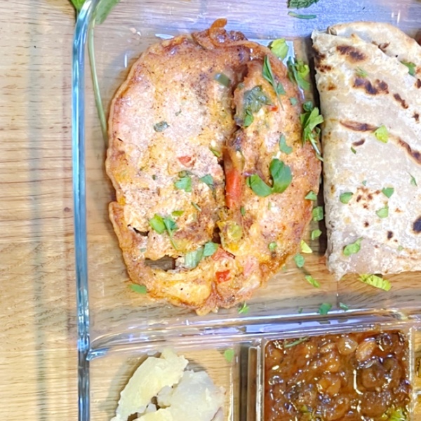Desi's Breakfast - Plain Paratha, Spicy Omelette, Chana Masala, Halwa, Pickles.
