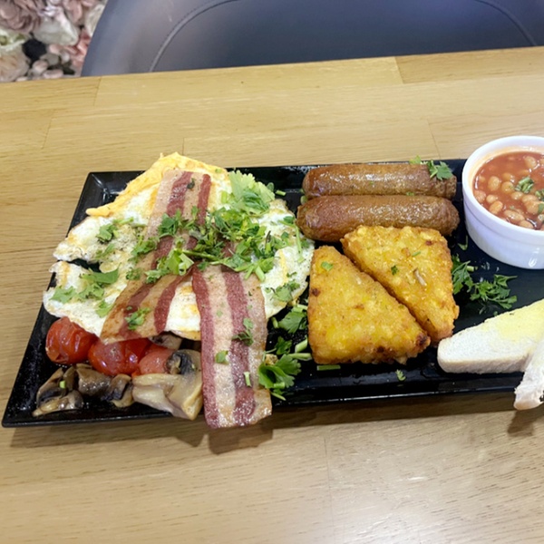Full English - 2 Eggs Of Your Choice, 2 Hashbrowns, Cherry Tomatoes, Mushrooms, Beans, Toast, Chicken Sausage, Turkey Rasher