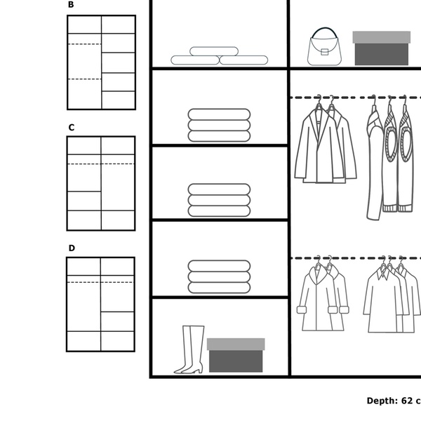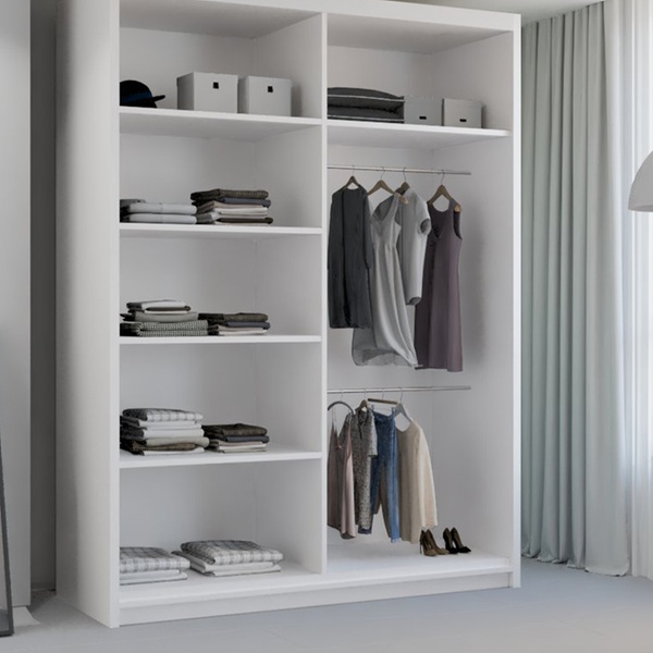 • 150cm: 2 x sliding doors, 4 x shelves and 2 x hanging rails