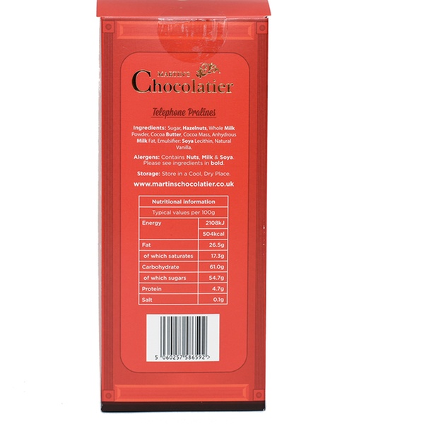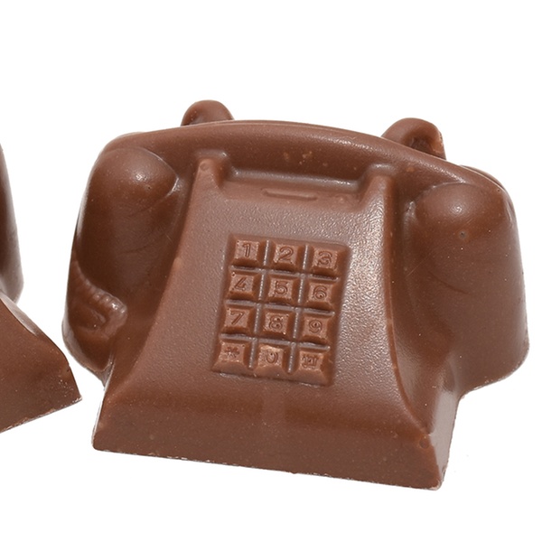 A collection of 12 telephone-shaped pralines handmade using high-quality Belgium chocolate couverture and creamy hazelnut filling