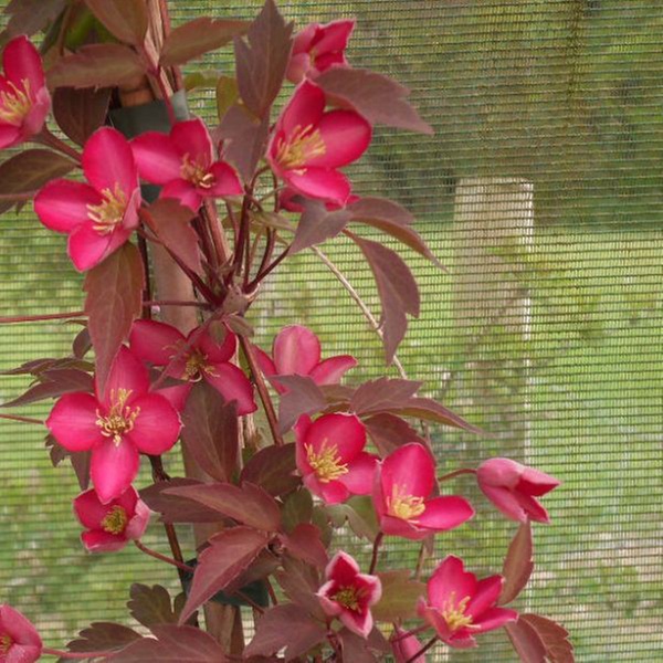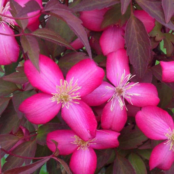 With stunning cerise-red flowers and unique bronze-green foliage, this clematis seamlessly brightens up walls and trellises