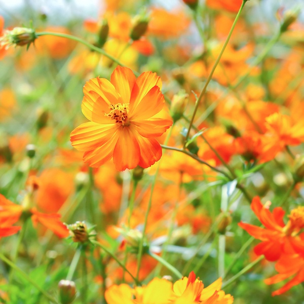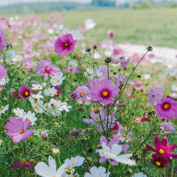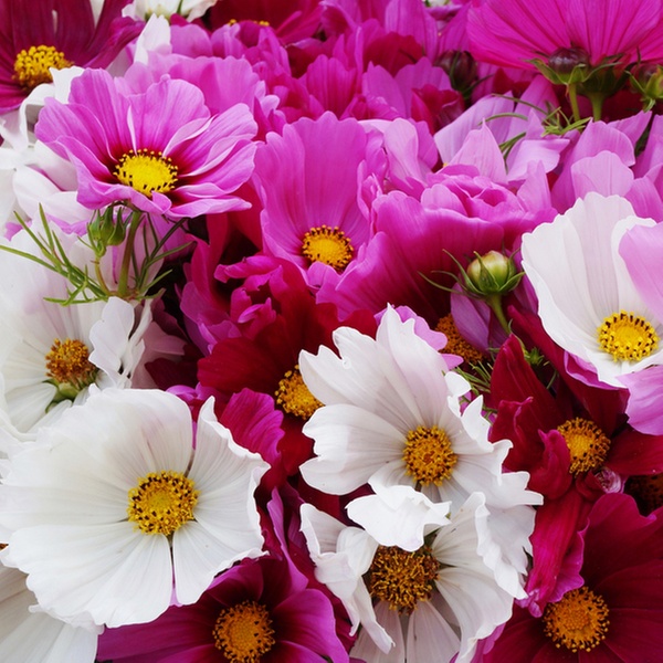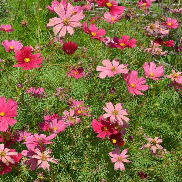 A mixed collection of summer-flowering Cosmos plants containing pink, red, white, yellows and bi-colour varieties
