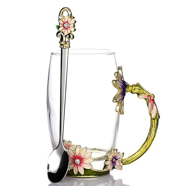 - Elegant glass teacup featuring a colorful flower design, complete with a matching lid and spoon.