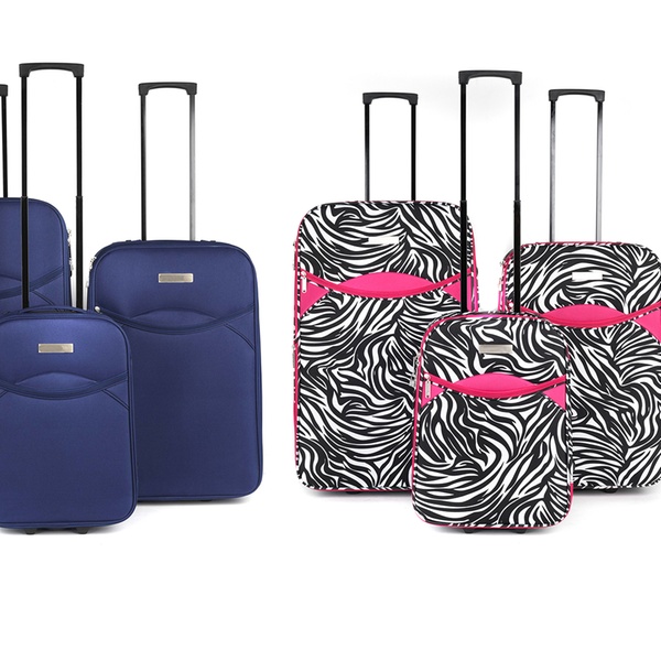 This tough and durable three-piece soft shell luggage set, featuring retractable top handles, is available in variety of colours