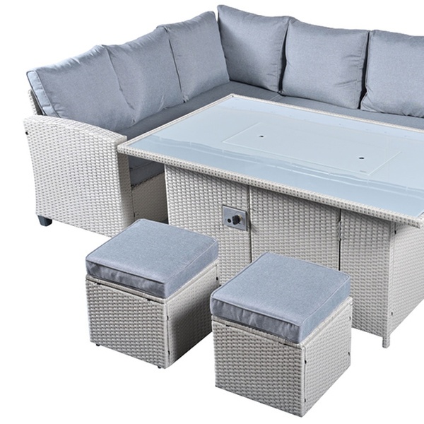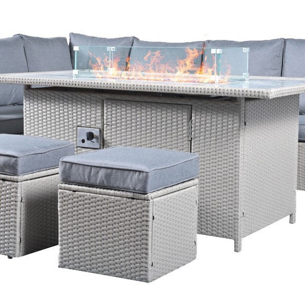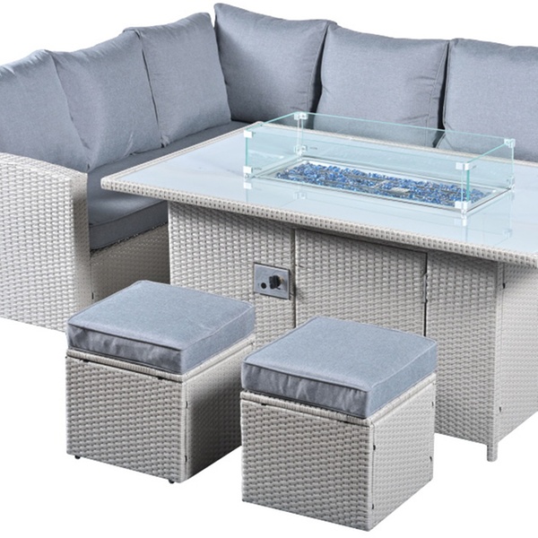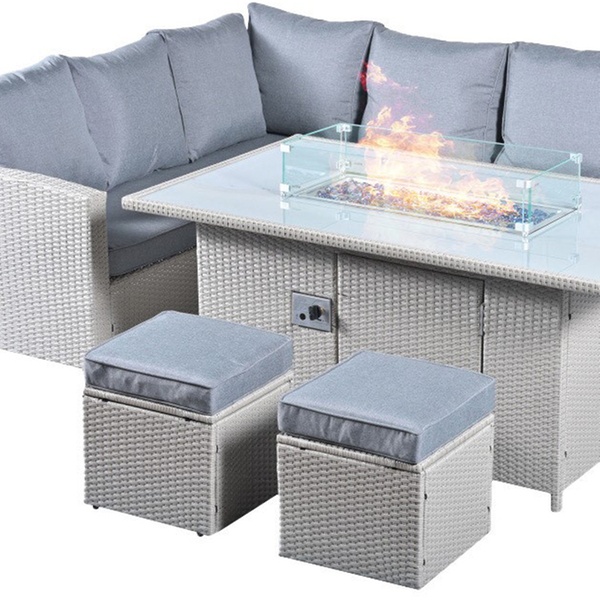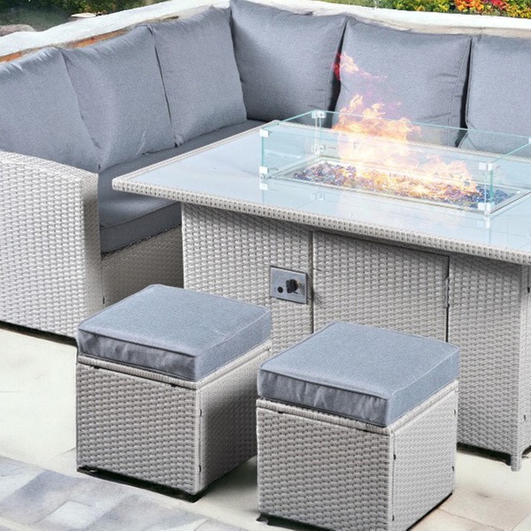 - 8-seat rattan fire pit garden set with a corner sofa, two stools, and a fire pit table in sleek grey