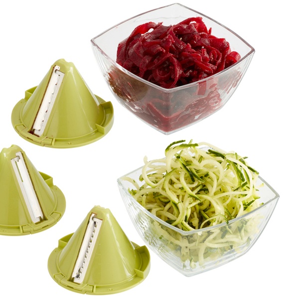- Three interchangeable blades for spaghetti, ribbons and slice