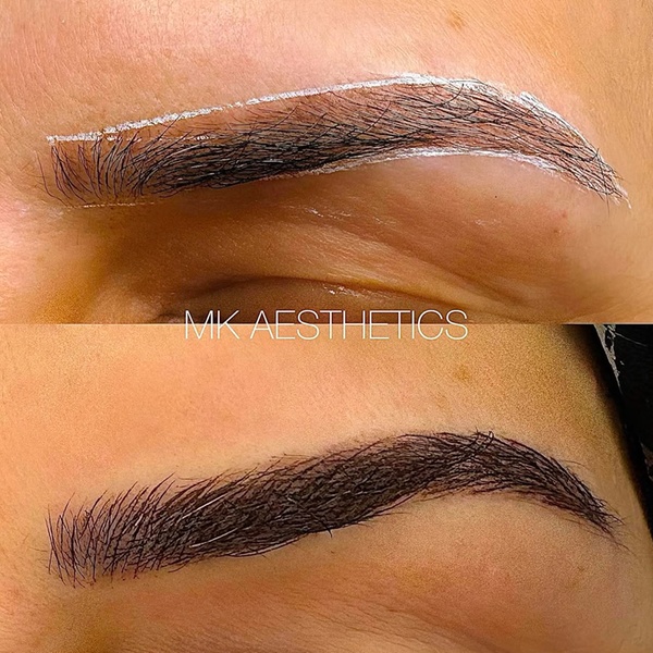 Microblading: After applying a numbing agent, technicians wield a handheld microblading pen to apply pigmentation underneath the skin, making hair-like strokes that look like natural eyebrow hair.