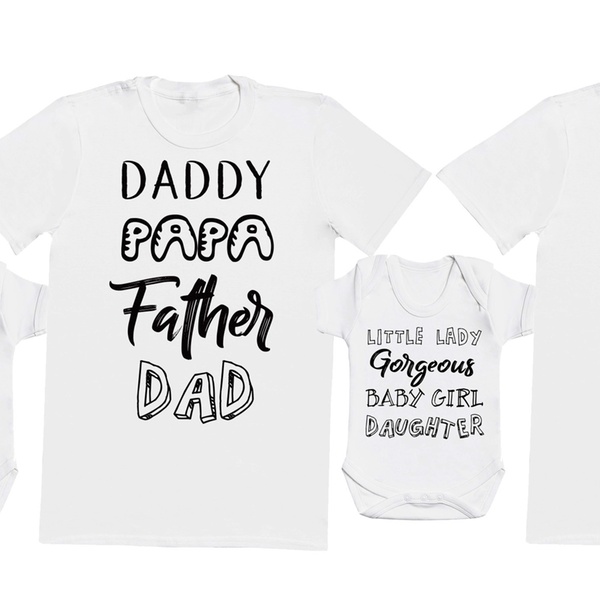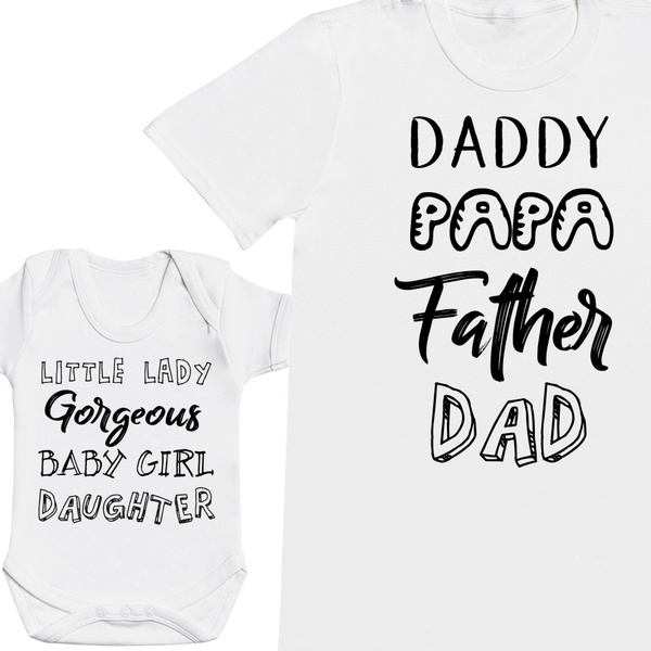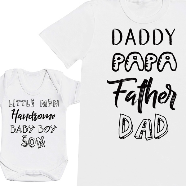 - Includes a men’s T-shirt and baby girl or baby boy bodysuit