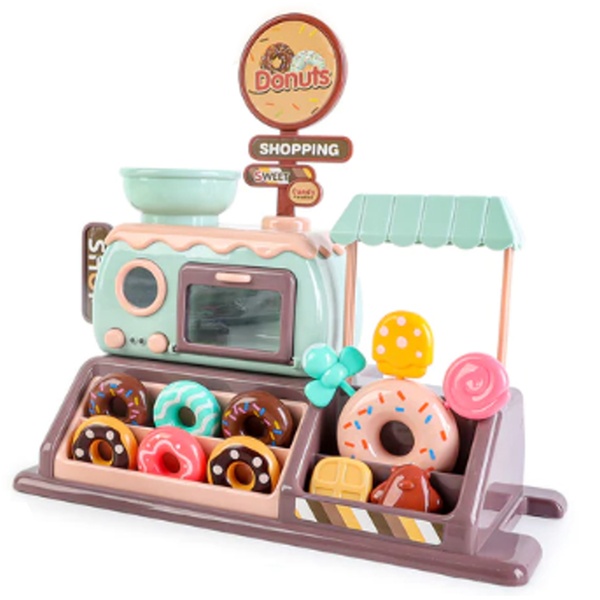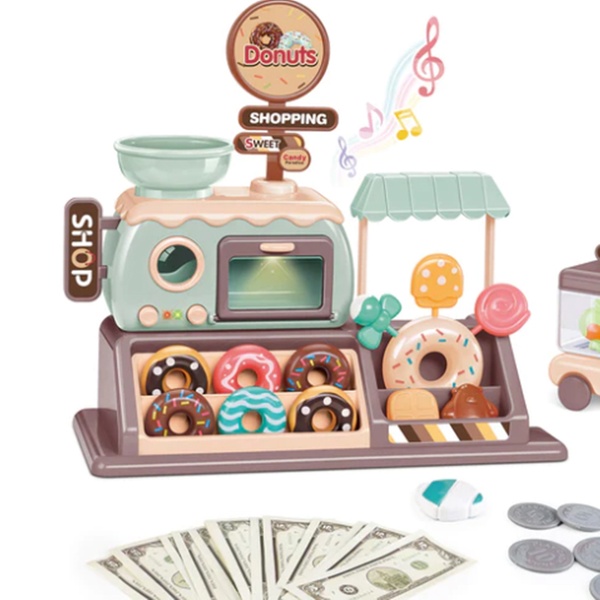 - Comes with a variety of accessories, including doughnuts, candies, a doughnut shelf, an oven, a doughnut and candy car, 6 coins, and 15 paper money