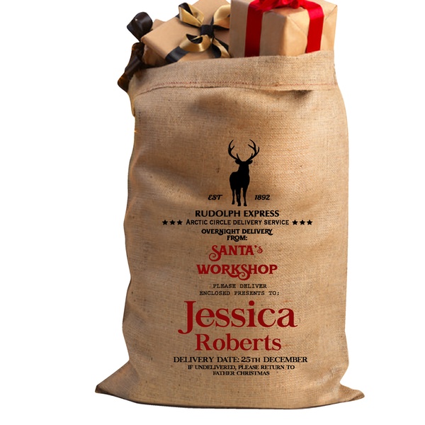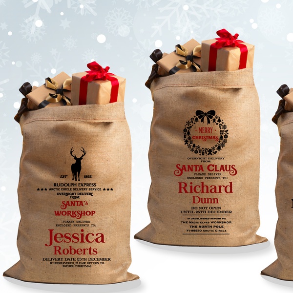 Add joy to your decor with personalised Christmas hessian sacks—North Pole Reindeer theme for a festive, one-of-a-kind touch.