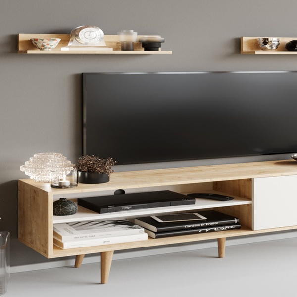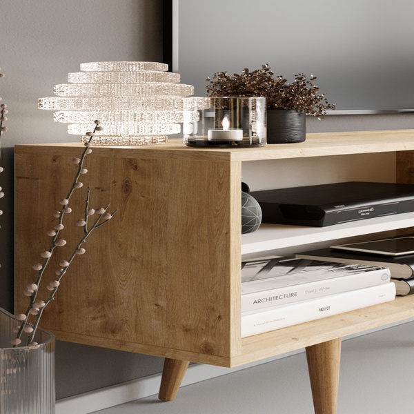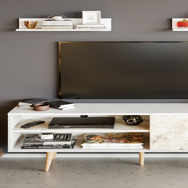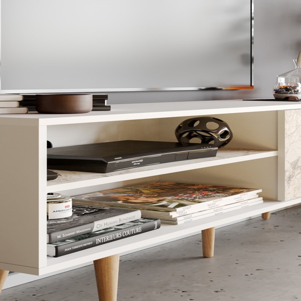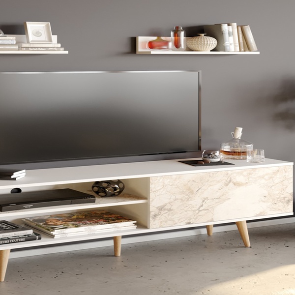 Elevate most entertainment spaces with this stylish TV stand featuring a spacious cabinet and sleek cable management for a clutter-free look