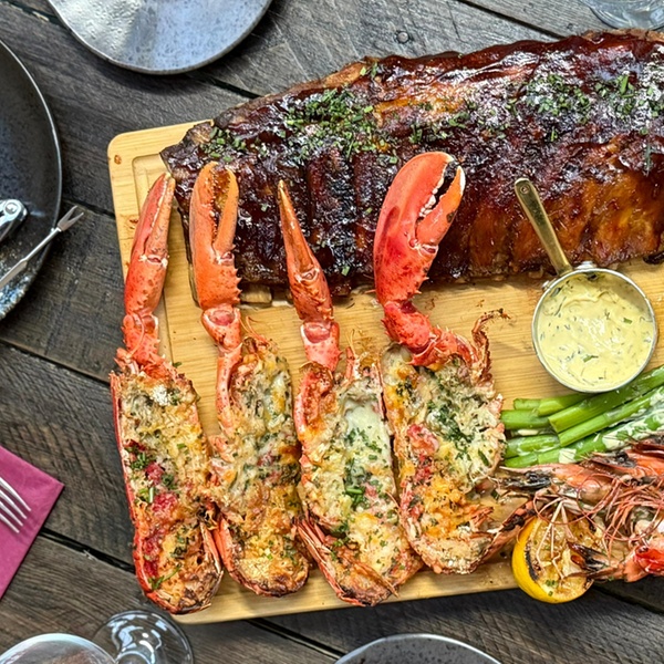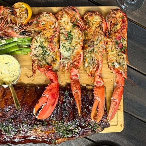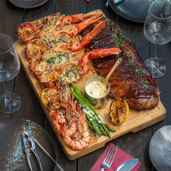 - Surf & Turf: Whole Lobster, Ribs and Seafood Platter with Bottle of Wine: Dive into an exquisite mix of whole lobsters, tender ribs, and prawns alongside asparagus hollandaise.