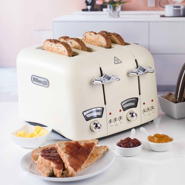 Suitable for most kitchens, this coffee maker and four-slice toaster feature a retro-effect design and are ideal for making breakfasts