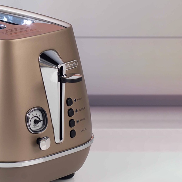 This retro Distinta toaster features a progressive electronic browning control and a removable crumb tray for a mess-free breakfast