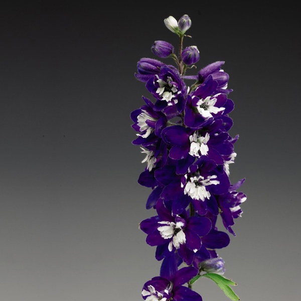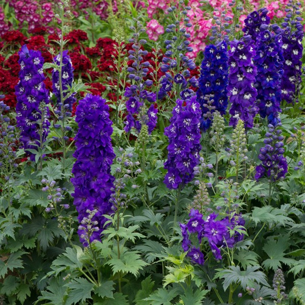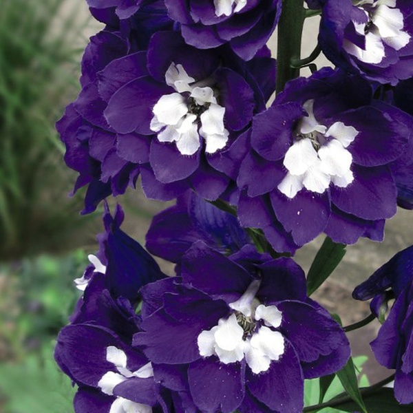 • Delphinium 'Dark Blue and White Bee' features intense dark blue flowers with a distinctive white "bee" shape at the centre