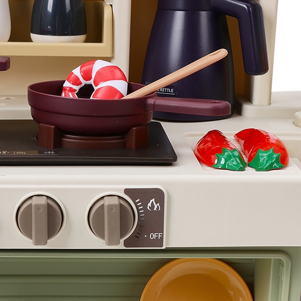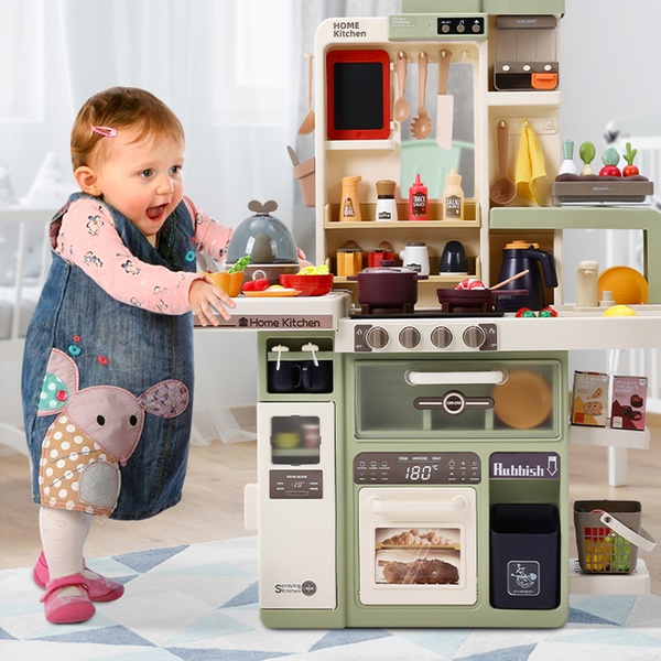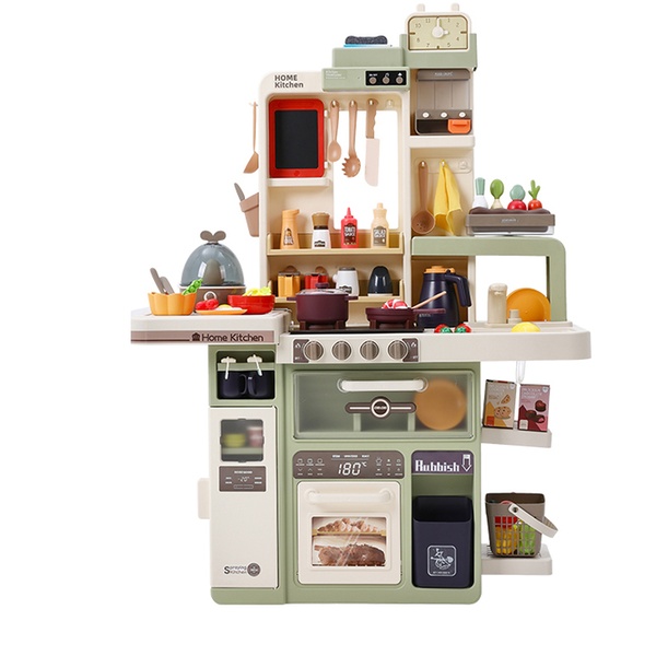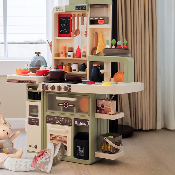 - All-in-one kitchen playset includes a stovetop, oven, dishwasher, refrigerator, sink, and 88 realistic accessories