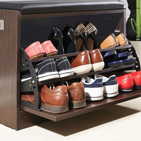 This stylish bench features a smooth-action front that opens to reveal three shelves that keep shoes neatly organised and easily accessible