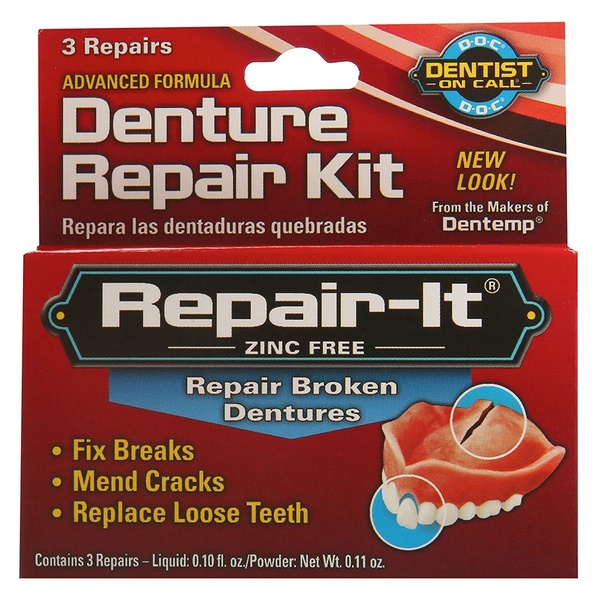 Incorporates a specially designed denture repair liquid and powder which are mixed together to form a substance that aims to stick the dentures together