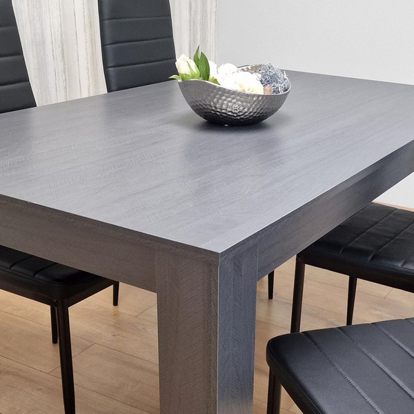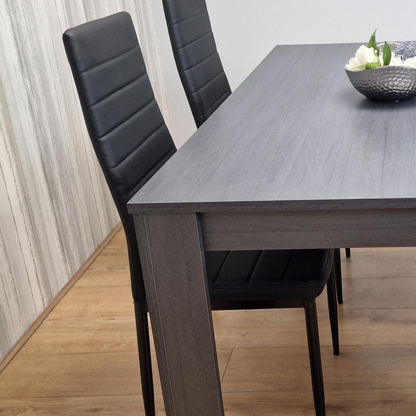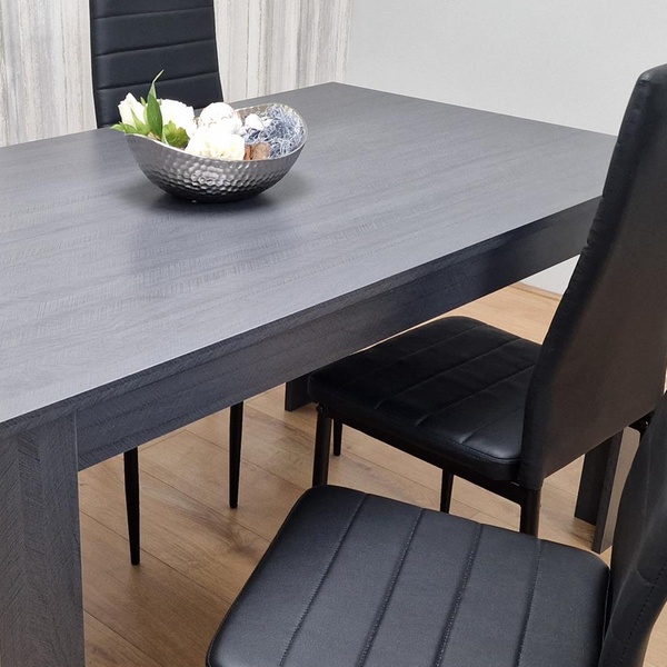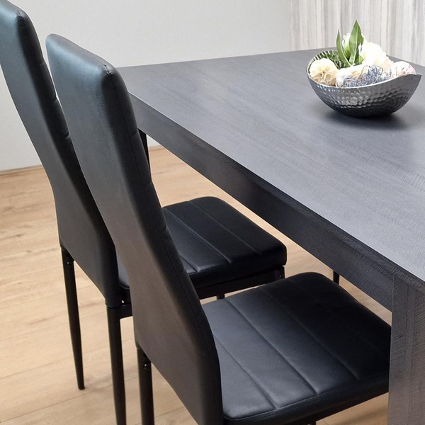 A stylish dark grey wooden-effect dining table with a charcoal hint, paired with four black leather-padded metal chairs featuring slightly curved backs for ergonomic comfort