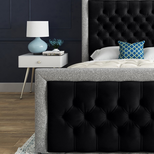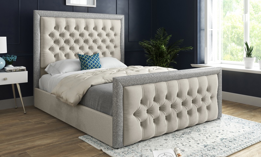 Crafted in West Yorkshire, this super king bed boasts a luxurious buttoned headboard and an enchanting glittered border for elegance