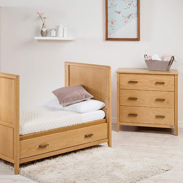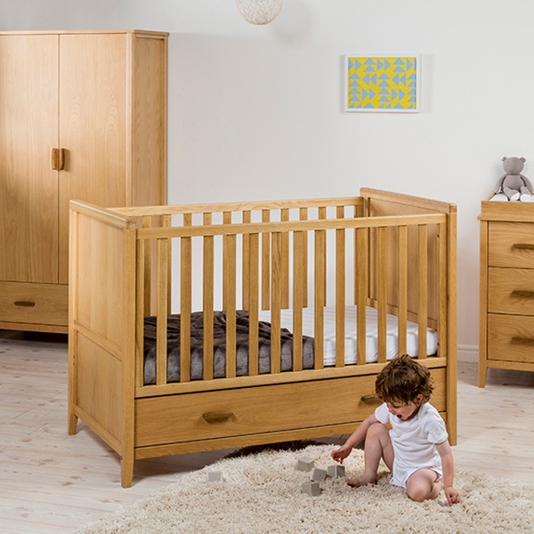 This furniture set is made from solid oak with oak veneer to give a new nursery a stylish, modern look