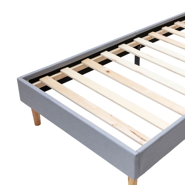 Platform bed with a space-saving design, features grey fabric upholstery and comes with optional mattress