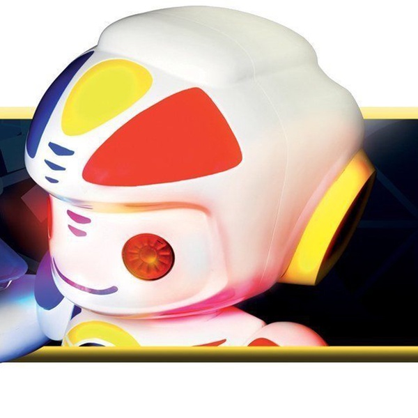 Featuring spring-loaded gripping hands, this versatile robot boasts a voice modifier and a backpack storage space