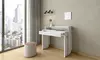A smart and stylish extendable desk designed for compact spaces, featuring a fold-out design, white wood-grain finish, and durable melamine construction