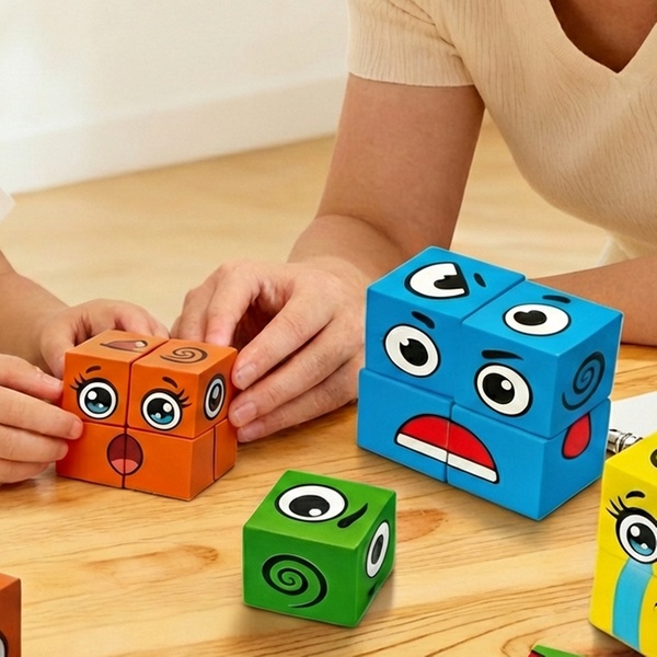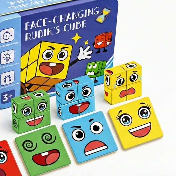 A fun and educational wooden face-changing puzzle game with 16 blocks and challenge cards that encourages logical thinking, coordination and interactive play for children aged 6+