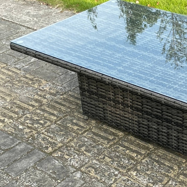 - Handmade flat PE rattan with 5mm thick clear tempered glass top featuring suction to prevent sliding