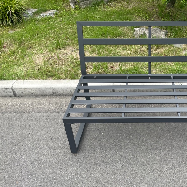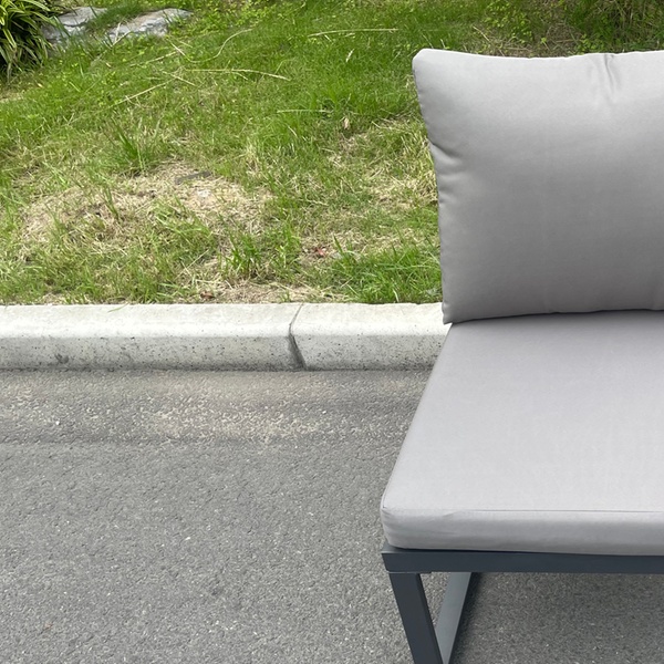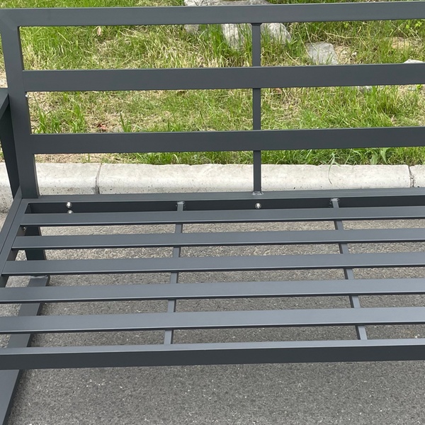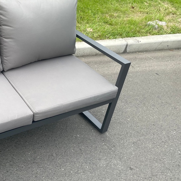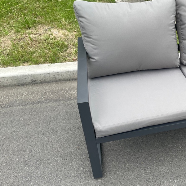 - Dark grey powder-coated finish with matching fabric, noting potential colour variations