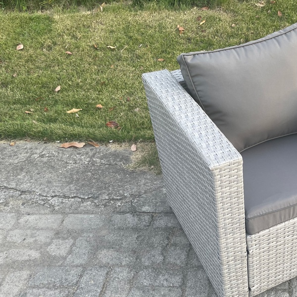 This outdoor set features handmade light grey rattan, dark grey cushions, a dual-use adjustable table, rust-resistant steel frames, and low-maintenance, removable covers for lasting comfort and style