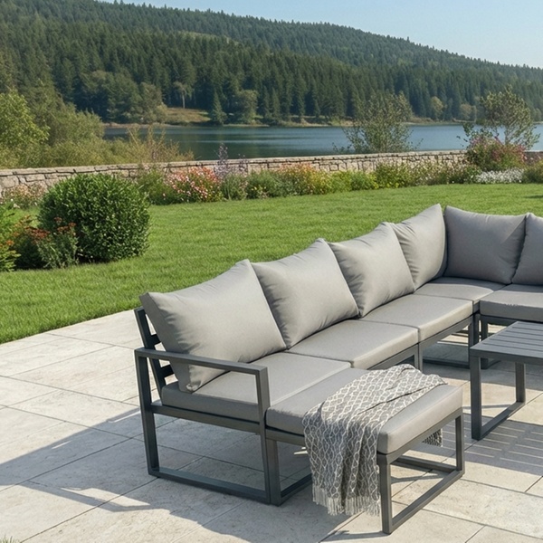 Engineered from high-quality powder-coated alloy aluminium, this modular corner sofa is designed for ultimate structural durability and rust resistance. Featuring 9cm thick cushions and an all-aluminium coffee table, this handmade set offers a modern solution for stylish patio entertaining.