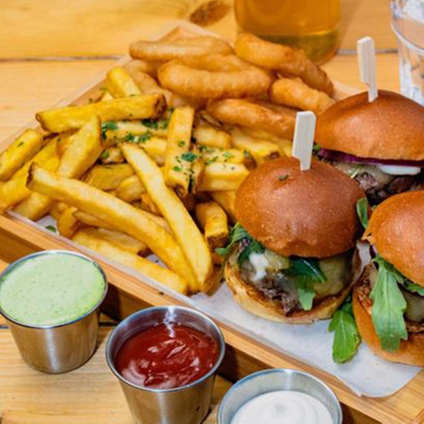 - Smithfields Platter Four mini burgers, skinny fries, onion rings