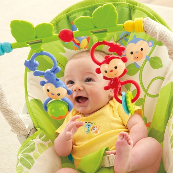 Featuring a reclining seat, this rocker boasts bat-at toys that keep a baby entertained and help strengthen their senses