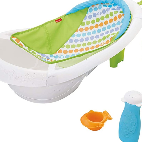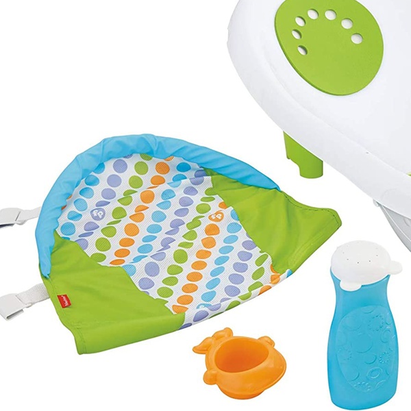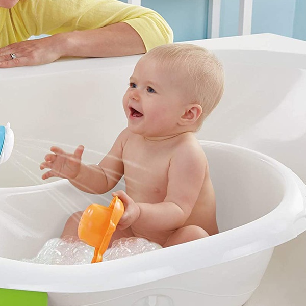 - Includes squeeze bottle and scoop toy for gentle rinsing and play