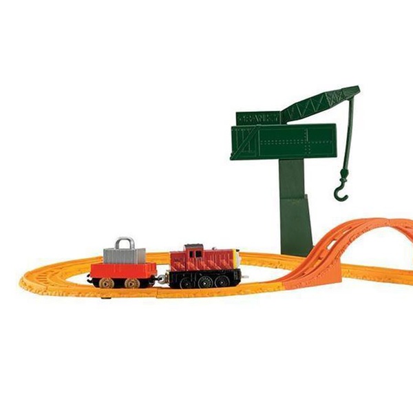- Set includes: figure-8 track with a bridge, Salty and Cranky, cargo truck, boat, train station building