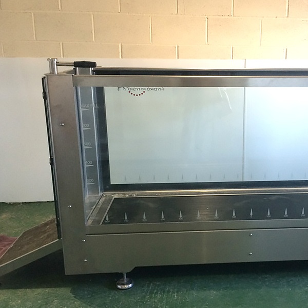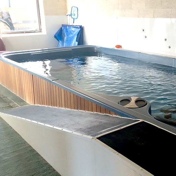 A dog will paddle for 40 minutes in a heated pool fitted with swim jets for light resistance, followed by a shower and towel-dry
