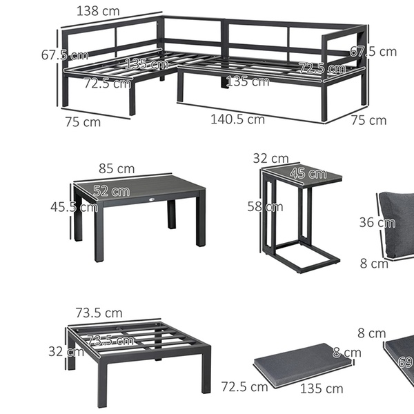 - Seat cushion size: 135cm (L) x 72.5cm (W), 69cm (L) x 69cm (W)