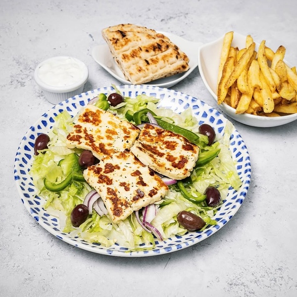 • Pita Halloumi – Tomatoes, onion, tzatziki, chips.