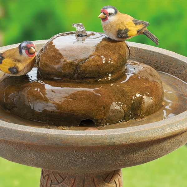 - Fountain bird bath that comes with optional two decorative robins or goldfinches