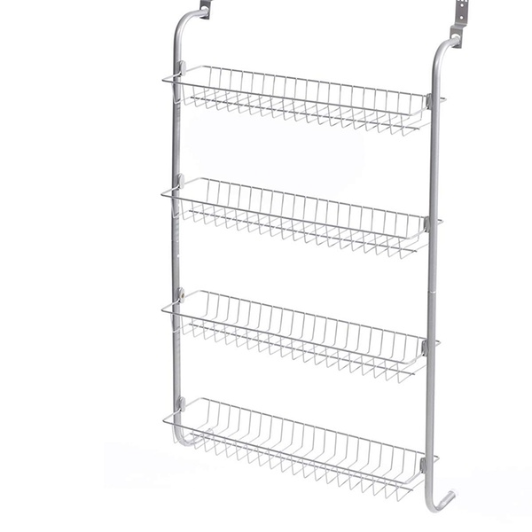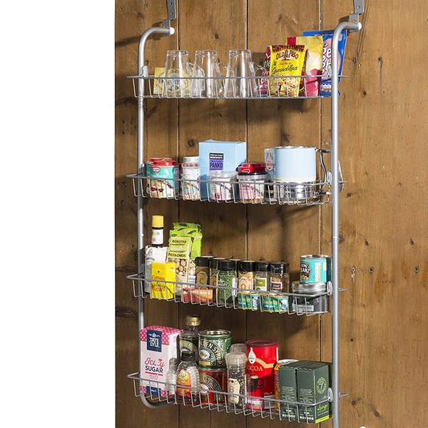 Ideal for storing tinned food, packets and spices, this rack comes with four clip-on shelves and can be hung over a door