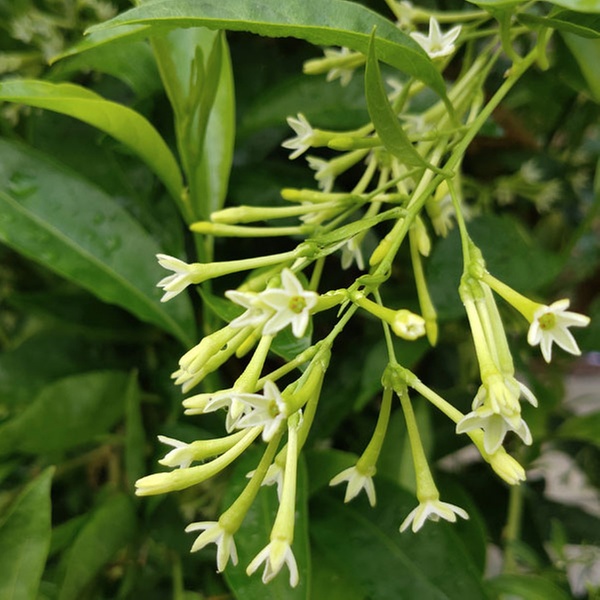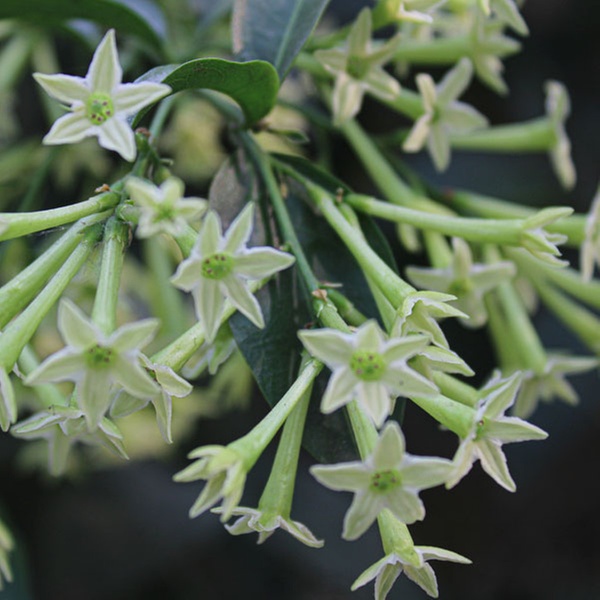 - Evergreen foliage is adorned with clusters of starry, tubular blooms