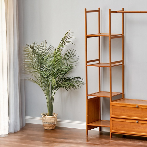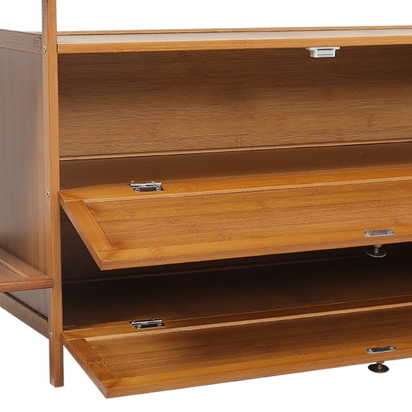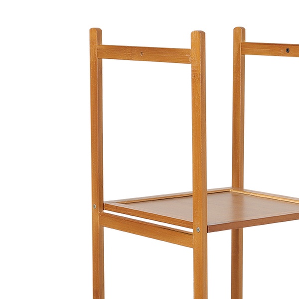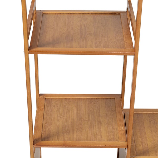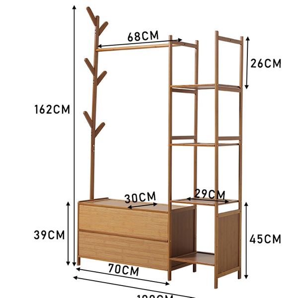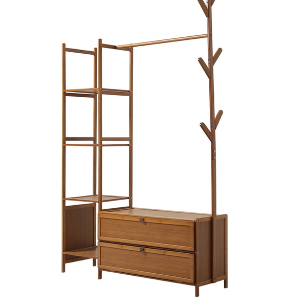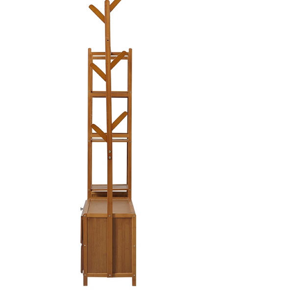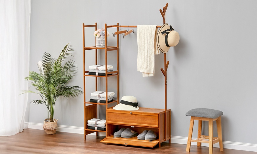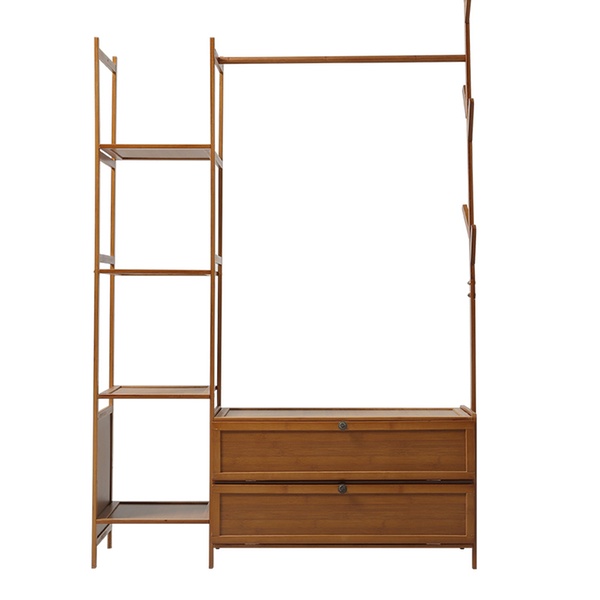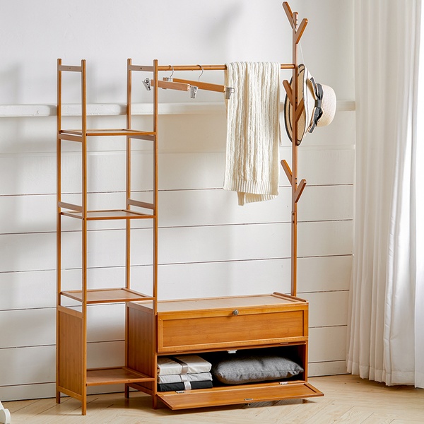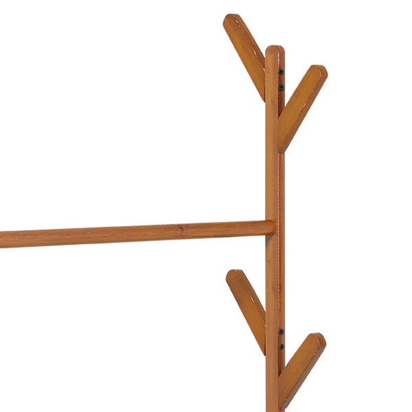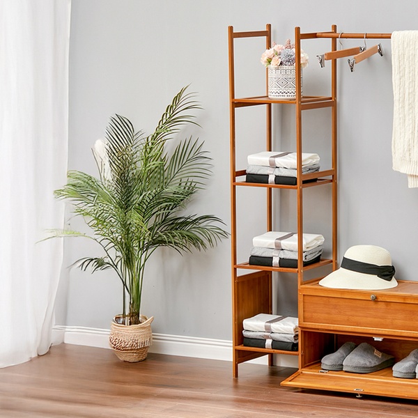 Maximise organisation with a sleek, freestanding bamboo rack featuring a four-tier shelf, coat tree, and hanging rod for easy access