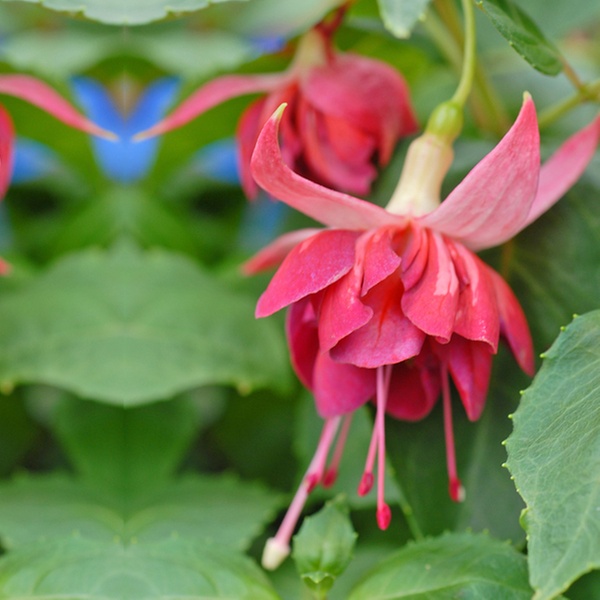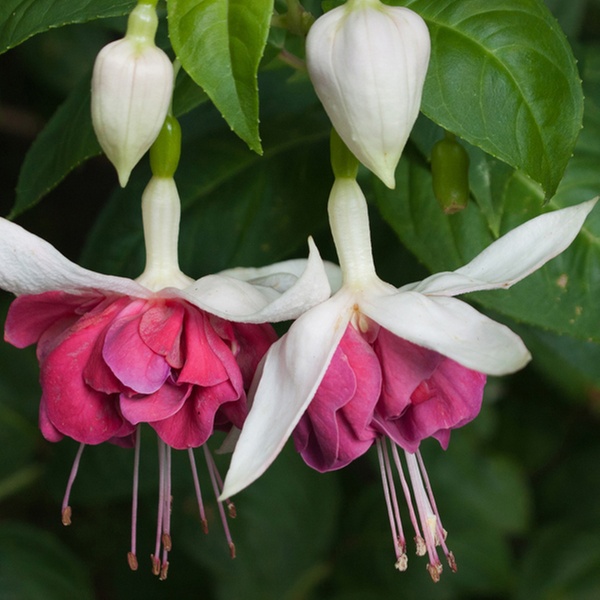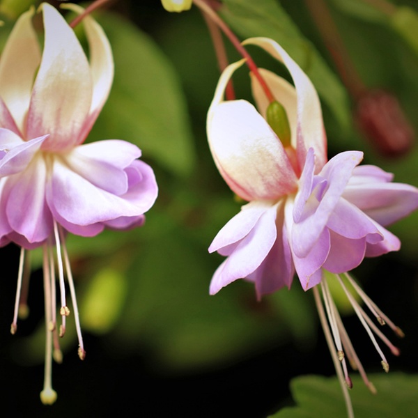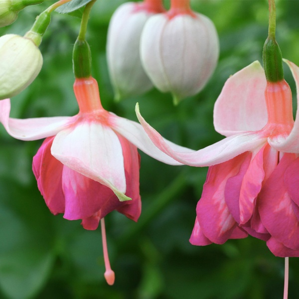 - Fuchsia 'Heri Mochara': pastel blooms with a striking contrast